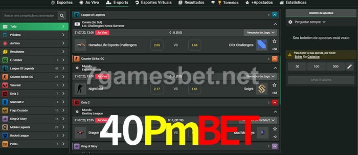 O 40Pmbet oferece uma grande seleção de opções de apostas em e-sports com probabilidades competitivas